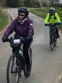 Health & safety tip for the day – check your bike before riding – brakes, tyres etc. In spring weather that can be variable (like suddenly cold, as today), take extra bits of clothing (extra gloves, buff, helmet cover), in case you need them. And there’s another bit of emergency kit that I always have – my husband Jim is always available to drive to collect anyone (and their bike) in my group that needs a lift home. I’m not one who can fix punctures quickly on the road, and particularly dislike getting cold or wet during bike repairs! Much better done in the warmth of the kitchen!